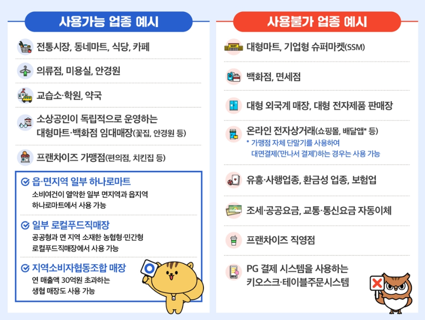 - 사용가능 업종: 전통시장, 동네마트, 식당, 카페, 미용실, 안경원, 약국, 학원, 편의점, 치킨집 등