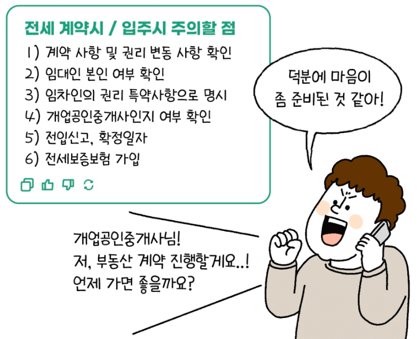 | 계약 중·후 | ① 계약사항 및 권리 변동 사항 확인 ② 임대인 본인 여부 확인 ③ 임차인의 권리 특약사항으로 명시 ④ 개업 공인중개사 여부 확인 ⑤ 전입신고 및 확정일자 받기 ⑥ 전세보증금반환보증 가입 |